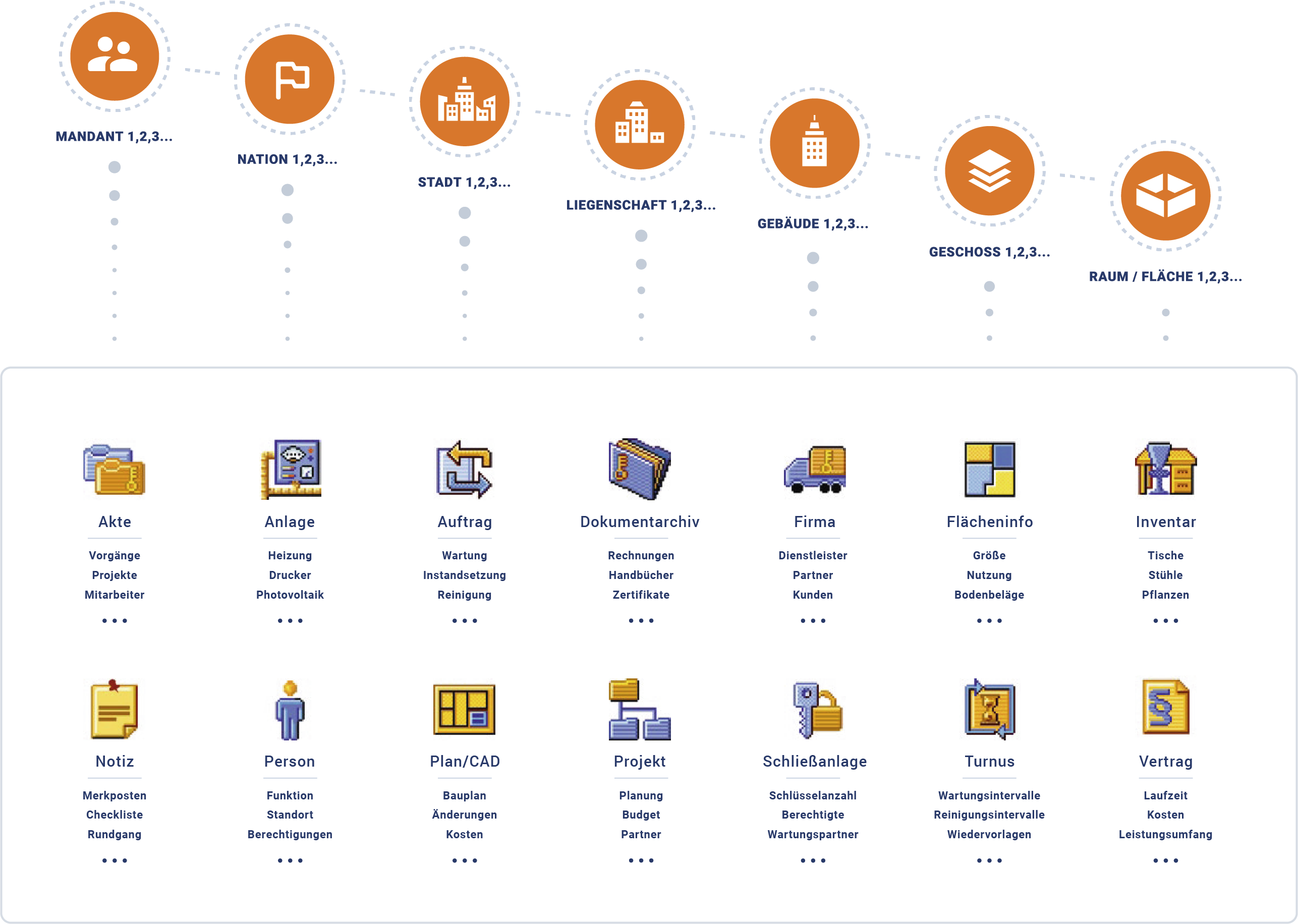 Jedem Ort – vom Mandant bis zum Raum bzw. zur Fläche – können Sie bei KeyLogic ganz nach Bedarf Datenobjekte zuordnen, um die dazugehörigen Informationen nach einer logischen inhaltlichen Struktur abzulegen. So können Sie beispielsweise jedem Gebäude die vorhandenen Mietverträge, Reinigungsvereinbarungen und Pläne zuordnen. Für jedes Geschoss, die dort vorhandenen Anlagen und aktuellen Projekte erfassen. Oder festhalten, welches Inventar sich in welchem Raum befindet, wer den Raum nutzt und einen Schlüssel dazu hat.